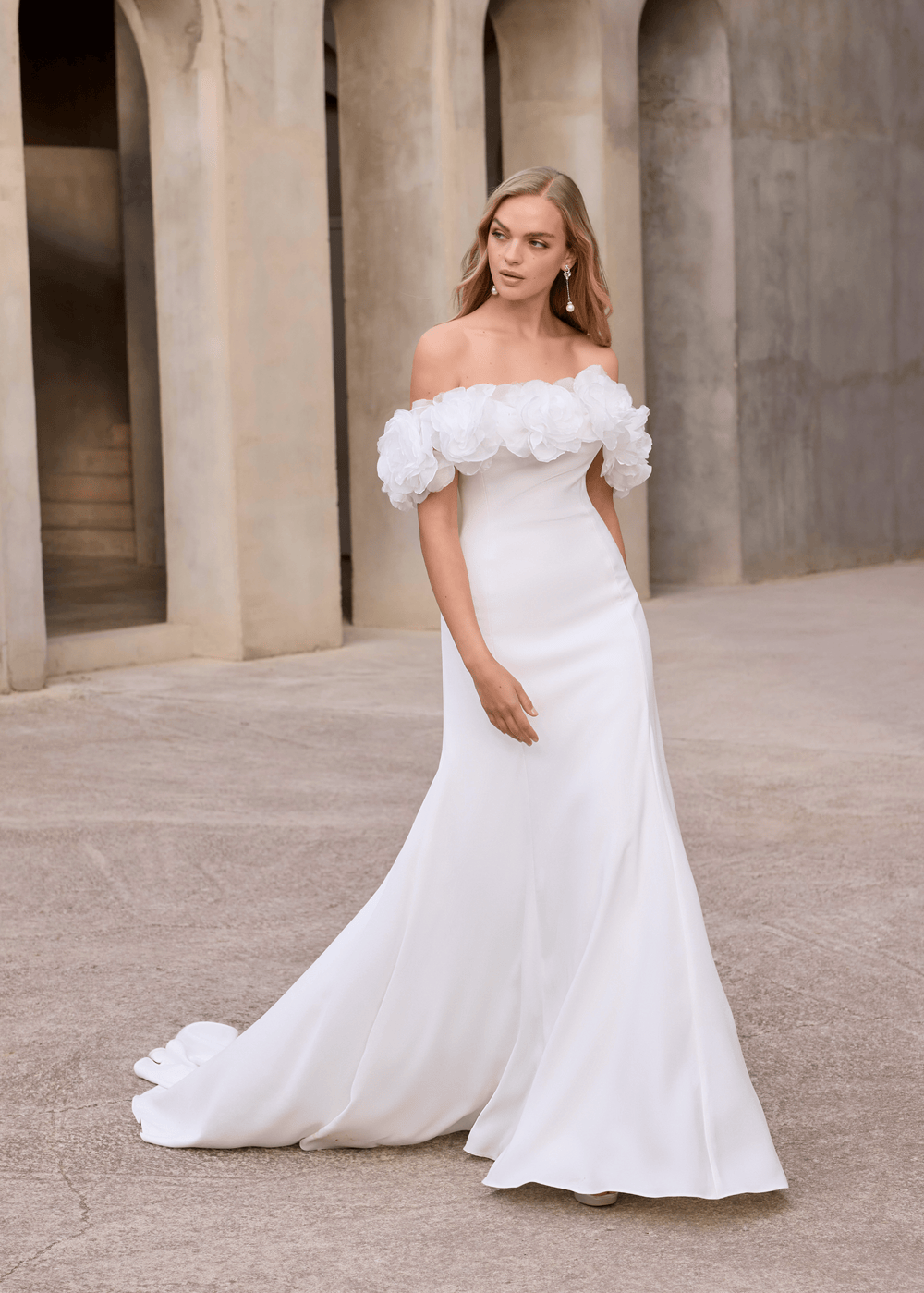 DETACHABLE OFF THE SHOULDER ROSETTE DRAPE CREPE FIT TO FLARE