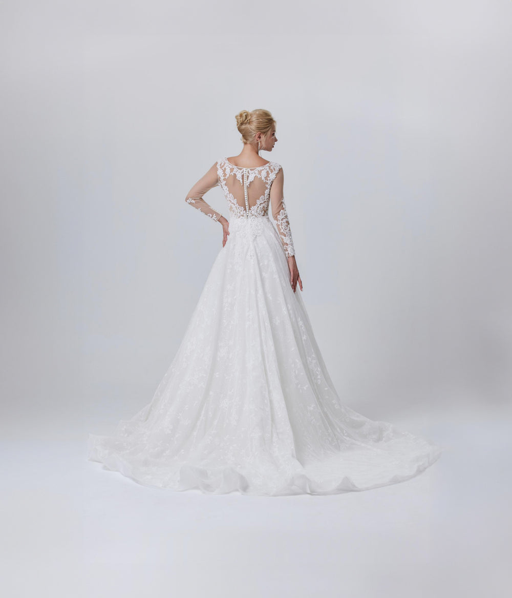 Elevating bridal fashion with a V-neckline and embroidered tulle sleeves, this gown showcases 3D floral embroidery over nude mesh. The back combines a zipper and buttons for a secure fit. Made from premium organza and floral embroidered tulle